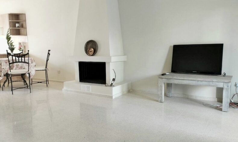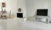 Дом двухэтажный, на первом этаже располагается просторная кухня-гостиная с камином по центру. Есть выходы на террасу расположенную перед домом и на террасу во дворе, через которую можно попасть на приватную дворовую территорию дома. Также на первом этаже есть раздельный санузел с душевой.