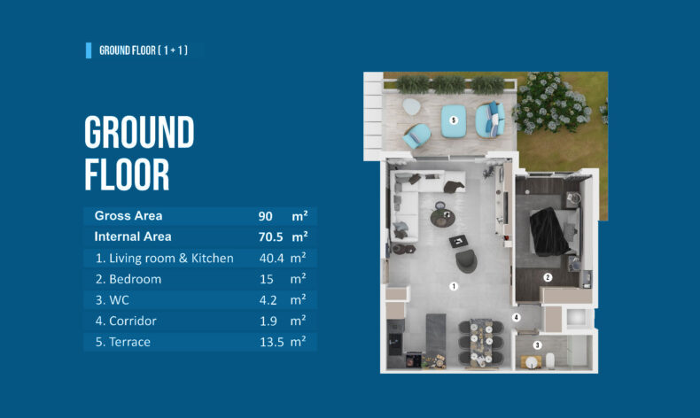 Квартира с планировкой 1+1 в граунде общей площадью 90 кв.м представляет собой современное и удобное жилье. В ней имеется кухня-гостиная, одна спальня и один санузел. Просторная кухня-гостиная создает уютное пространство для приготовления пищи и отдыха. Одна спальня предоставляет комфортное место для отдыха и сна. Санузел оборудован всем необходимым для удобства жильцов. Дополнительным преимуществом является терраса площадью 13,5 кв.м, которая идеально подходит для отдыха на свежем воздухе. Стоимость 143 000 £.