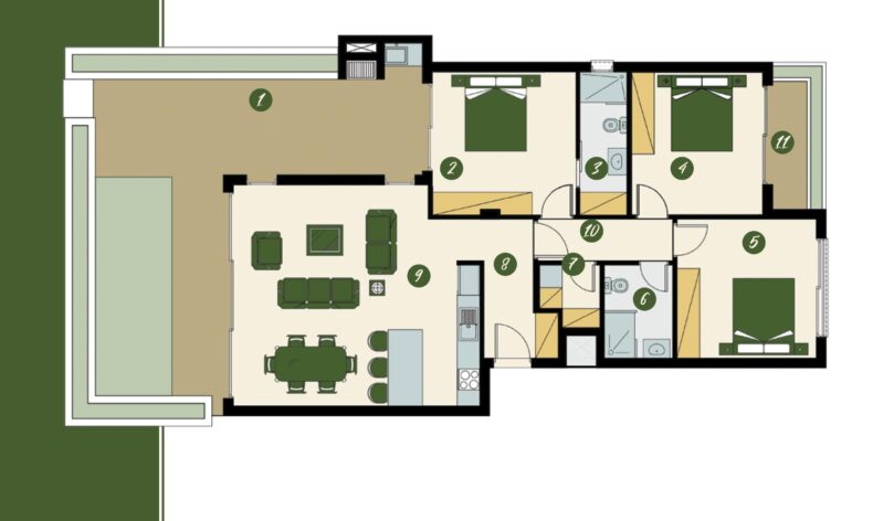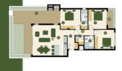 Проект состоит из апартаментов с двумя и тремя спальнями с выходом в сад или просторной террасой на крыше. Приверженцы открытых пространств оценят апартаменты с планировкой «лофт» в два уровня. Все апартаменты сдаются с полной чистовой отделкой, окнами ПВХ, встроенными шкафами, инфраструктурой под кондиционеры. В комплексе предусмотрена пожарная сигнализация и автоматическая система пожаротушения в помещениях общего пользования. А также будет профессионально обслуживание комплекса.