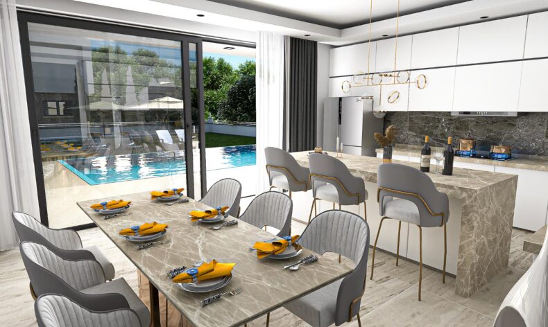 Проект представленный 18 отдельно стоящими виллами 3+1 с частным бассейном, что обеспечит ощущение эксклюзивности и приватности. На первом этаже виллы находится большая входная зона, гостиная, отдельная кухня, обеденная зона. Также на первом этаже расположена задняя терраса и гостевой туалет. На втором этаже находятся три спальни с балконами французского типа и встроенными шкафами. Все виллы оснащены гидрофорной системой и системой нагрева воды на солнечных батареях, инфраструктурой кондиционеров, современным кухонным гарнитуром (разные расцветки), окнами ПВХ, качественной сантехникой и мебелью для санузлов. С балконов и окон вилл открывается шикарный вид на море. Есть сад, детская площадка и зона барбекю. К тому же, на территории виллы есть уютный камин, что добавляет общей привлекательности и комфорта этим изысканным домам. Для каждой виллы предусматриваются два парковочных места.