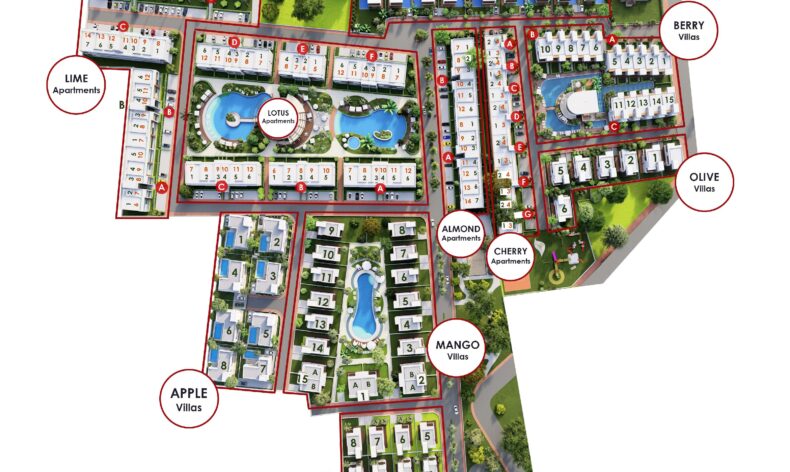 Проект занимает территорию площадью 20 000 кв. м, включает комфортабельные апартаменты и таунхаусы различной площади, а также отдельно стоящие виллы с тремя и четырьмя спальнями с собственным участком и бассейном. Все апартаменты и виллы идут с чистовой отделкой, полностью оборудованными ванными комнатами, кухнями со встроенными гарнитурами, шкафами для хранения в спальнях. С просторных балконов открывается вид на финиковые пальмы и банановые деревья, а также на зеленую зону вокруг бассейна.