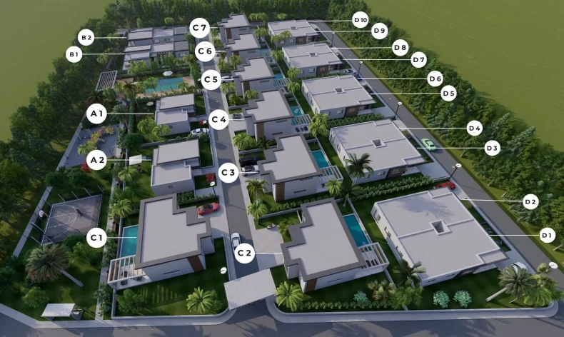 В проект предоставлены 21 вилла 4-х разных типов: отдельно стоящие виллы с двумя и тремя спальнями, виллы дуплекс и смежные виллы. Из панорамных окон открывается прекрасный вид на бассейн, зоны отдыха в окружении деревьев. В каждой вилле есть кухня-гостиная, 2 санузла «под ключ», встроенная корпусная мебель на кухне и в спальне. Дизайн-пакет с полной меблировкой предоставляется за отдельную плату. У каждой виллы в комплексе своя придомовая огороженная территория с парковочным местом, садом или бассейном.
