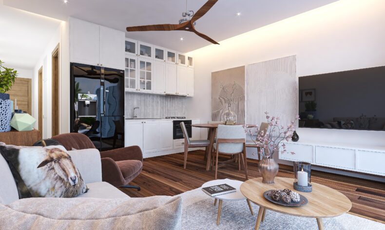 Этот комплекс состоит из апартаментов с одной, двумя и тремя спальнями, а также роскошные бунгало с тремя спальнями и частными садами. Апартаменты идут в чистовой отделке люкс с кухонной мебелью, готовым санузлом и встроенными шкафами.