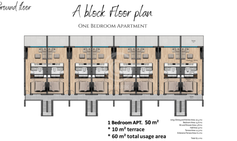 Проект состоит из широкого выбора апартаментов от студий до пентхаусов и просторных вилл. В зависимости от варианта выбранных апартаментов, приятным дополнением будет собственный сад, просторная терраса или личный бассейн. Все апартаменты идут в чистовой отделке люкс: выделенное парковочное место, инфраструктура кондиционирования воздуха, окна с двойным остеклением, оборудованная гарнитуром кухня, главная входная дверь (деревянная), ванные комнаты со встроенной мебелью и сантехникой. Все коммуникации готовы к использованию.