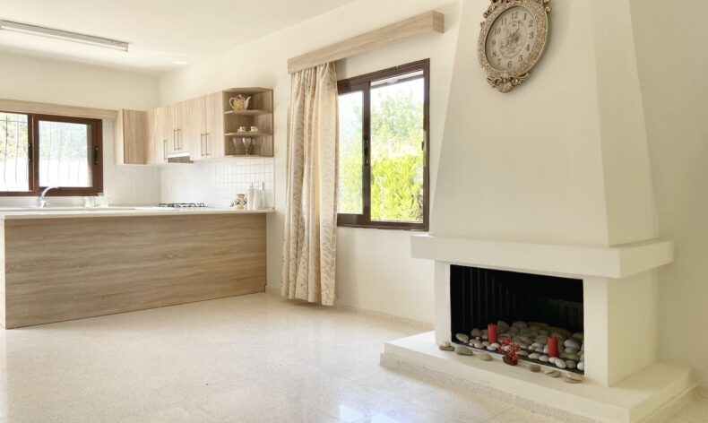 Дом двухэтажный, на первом этаже располагается просторная кухня-гостиная с камином по центру. Есть выходы на террасу расположенную перед домом и на террасу во дворе, через которую можно попасть на приватную дворовую территорию дома. Также на первом этаже есть раздельный санузел с душевой.