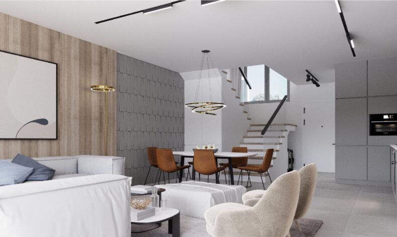Просторный светлый таунхаус 2+1 общей площадью 100 м² с высокими потолками и большими панорамными окнами, которые наполняют комнаты дополнительным светом и объемом. В каждом таунхаусе есть 2 балкона площадью 13,5 м² и 6 м². На крыше — просторная терраса площадью 40 кв.м. На первом этаже расположена гостиная, совмещенная с кухней, а также гостевой туалет. На втором этаже расположены 2 спальни, разделенные ванными комнатами.