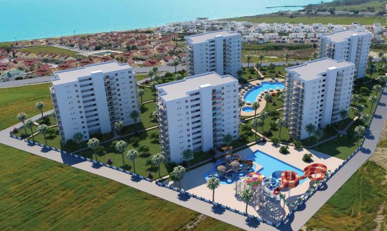 На охраняемой и цветущей круглый год территории комплекса представлен обширный спектр разнообразных услуг: аквапарк с водными горками для всех возрастов, открытые бассейны с шезлонгами и зонтиками, крытый подогреваемый бассейн с сауной и джакузи, а также полностью оборудованный фитнес-центр, детские и спортивные площадки, детский клуб, СПА-центр, ресторан, и многое другое. В комплексе есть собственный песчаный пляж с оборудованной зоной отдыха, пологим входом в море и прочими пляжными активностями. Комплекс находится в шаговой доступности от центра города и современной инфраструктуры. Расстояние до Бафры (туристический центр) займет 15 минут, расстояние до аэропорта Эрджан составит 40 минут и 45 минут до аэропорта Ларнаки.