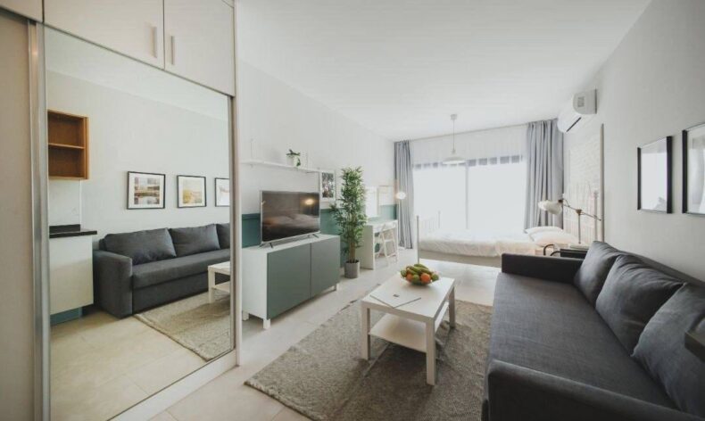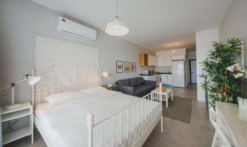 Студия на первом этаже. Дизайн пакет включен. Вид на инфраструктуру. Сдача квартиры в декабре 2024 г. Стоимость 92 400 £.