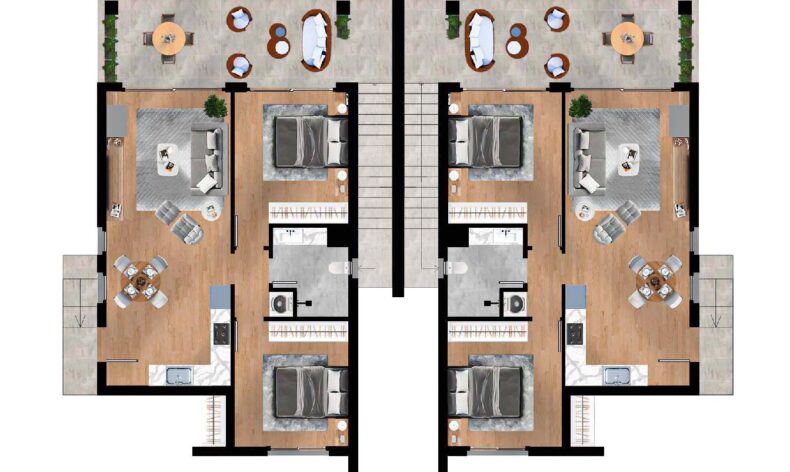 Проект, на земельном участке общей площадью 8,724 м², состоит из 27 резиденций. Есть одноэтажные виллы 2+1 и апартаменты 1+1. Квартиры на первом этаже имеют сад, а апартаменты на втором этаже имеют частную террасу на крыше. Каждая вилла имеет частную террасу на крыше, сад и парковочное место. Виллы Sunset 2+1 могут быть преобразованы в 3+1, а частный бассейн может быть добавлен за дополнительную плату. Все апартаменты сдаются с полной чистовой отделкой, массивными входными дверьми,окнами ПВХ, сантехникой, встроенными шкафами во всех спальнях, инфраструктурой под кондиционеры и тд.