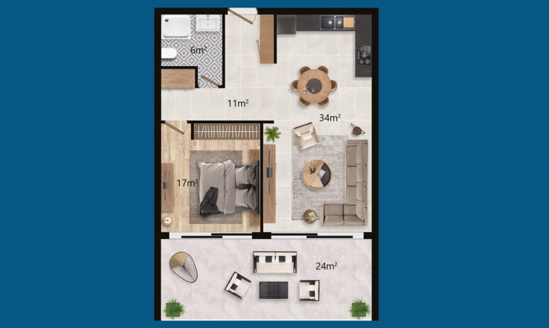 1+1 дуплекс 65 м² жилая площадь, 100 м² общая площадь, сад — 17 м², терраса 45 м²