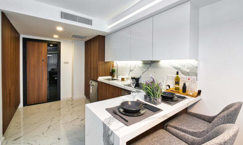 Первый жилой блок А — 27 этажей, 420 квартир и имеет бассейн и бар на последнем этаже.