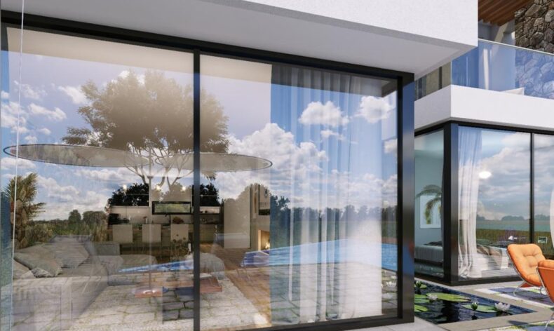 Вилла построена на участке земли 410 м². Собственная площадь 210 м². Планировка включает гостинную с кухней американского плана, безупречно спроектированные 4 отдельных спальни, 3 совмещенных санузла, дополнительный гостевой туалет и 2 террасы, включая террасу на крыше 30 м² с деревянными беседками, а также частный бассейн. Традиционные элементы внешней каменной стены, использованные в дизайне, гармонично сочетаются с окружающей природой. Благодаря удачному расположению, из окон открывается вид на море.