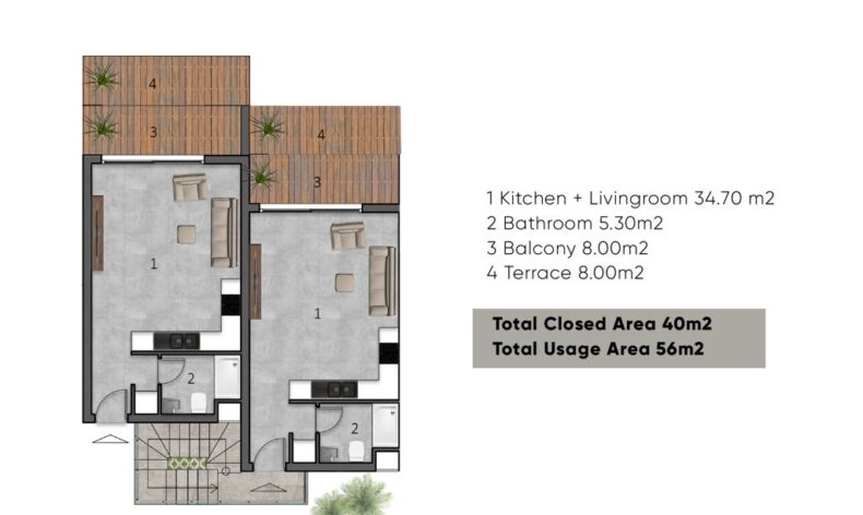Проект состоит из 5 блоков с типом апартаментов 0+1, 1+1, 2+1 и 3+1, а так же 4 отдельно стоящие виллы с собственный бассейном. Все апартаменты имеют вид на Средиземное море. Апартаменты на первом этаже имеют свой небольшой сад, апартаменты на втором этаже имеют собственную террасу (площадью от 40 до 53 м²) на крыше с зоной барбекю, где также можно установить джакузи. Все апартаменты в комплексе построены из высококачественных природных материалов, хорошо спланированы и сдаются в чистовой отделке, всей сантехникой, красивыми шкафами с прозрачным затемненным стеклом в спальне, кухонным гарнитуром и выводом коммуникаций для подключения кондиционеров.