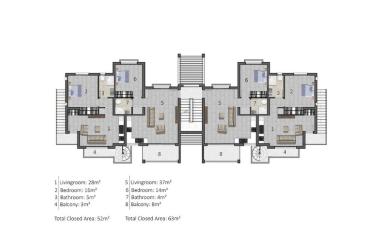 Проект состоит из 5 блоков с типом апартаментов 0+1, 1+1, 2+1 и 3+1, а так же 4 отдельно стоящие виллы с собственный бассейном. Все апартаменты имеют вид на Средиземное море. Апартаменты на первом этаже имеют свой небольшой сад, апартаменты на втором этаже имеют собственную террасу (площадью от 40 до 53 м²) на крыше с зоной барбекю, где также можно установить джакузи. Все апартаменты в комплексе построены из высококачественных природных материалов, хорошо спланированы и сдаются в чистовой отделке, всей сантехникой, красивыми шкафами с прозрачным затемненным стеклом в спальне, кухонным гарнитуром и выводом коммуникаций для подключения кондиционеров.