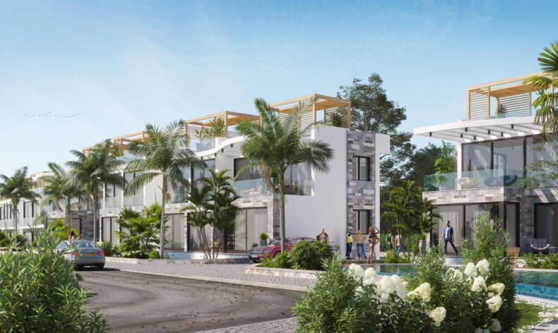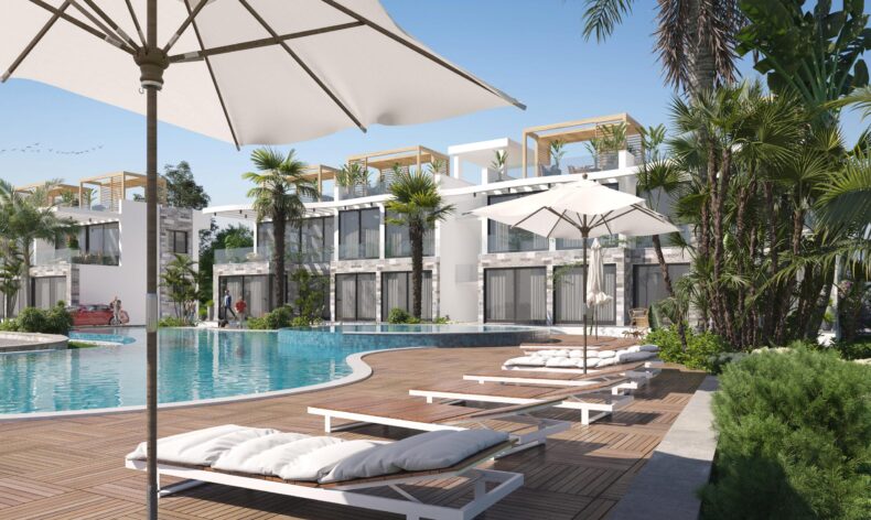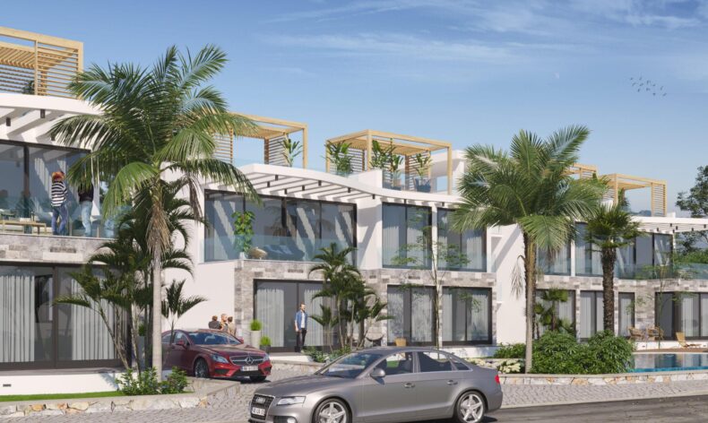 Проект находится в 100 метрах от моря, в 5 минутах езды от поля для гольфа Korineum, 30 минут езды до города Кирения и 45 минут езды от аэропорта Эрджан.