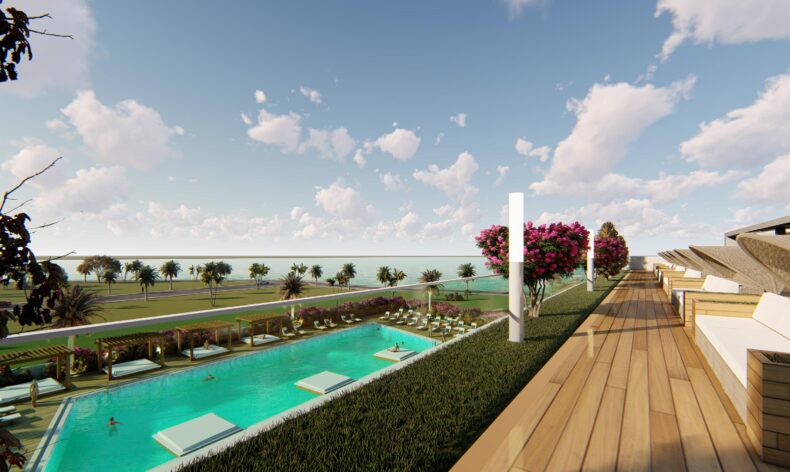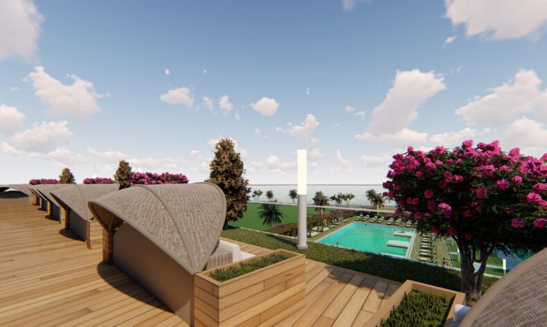 Проект жилого комплекса с уникальным дизайном, расположенный на первой береговой линии посёлка Лапта. С высоты птичьего полета этот комплекс похож на знак направления. На крыше комплекса обустроена уютная прогулочная видовая лаунж-зона с удобными скамейками, откуда открывается прекрасный вид на море и горы.